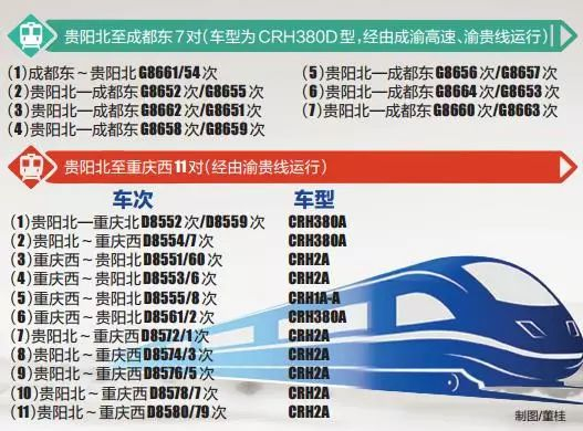 贵州都市报消息,记者从铁路部门获悉,渝贵铁路目前正在进行联调联试,这条铁路时速200公里,为客货两用,预计明年1月中旬开通运营,届时,贵阳到重庆只需要2小时左右、贵阳到成都只需要3.5小时左右。目前,渝贵铁路运输方案已经出台,开通后,新增动车组53对、普速列车10对,其中成都局管内贵阳北至重庆西11对、贵阳北至成都东7对,这18对动车组车次、运行路线及车型已经确定。(贵州都市报)
