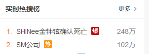 金钟铉死亡的消息一经传出,新浪微博话题瞬间爆了,昨晚霸占了微博热搜榜第一、第二名。