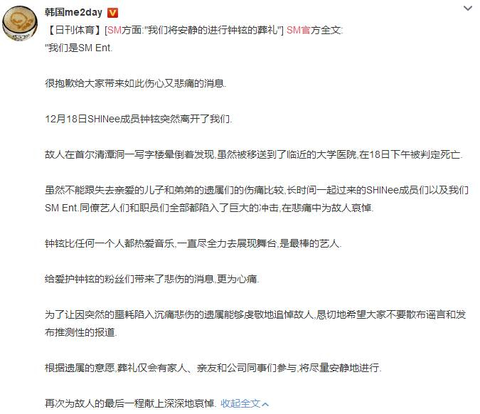 昨晚微博曾一度传出,金钟铉并未死亡而是被转入ICU的消息,给喜爱他的粉丝们又带来一丝希望。但是很遗憾,最终SM公司官方宣布,确认了金钟铉在18日下午判定死亡的消息。