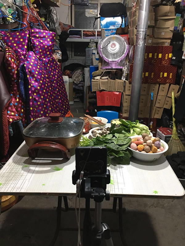 门外天色渐晚,白炽灯泡的灯光有些晃眼。小桌子上放满了一会儿要煮的食材和一个电磁炉。父母为避免打扰他们直播,躲到了隔壁的小房间。