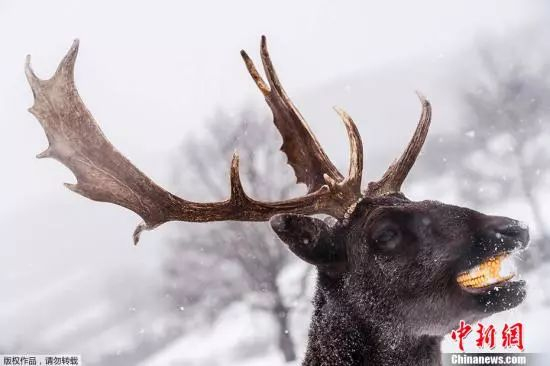2017年1月16日,科索沃的一个小镇上,一只牡鹿正在吃玉米,而此时科索沃正经历大雪天气,温度将会进一步下降。