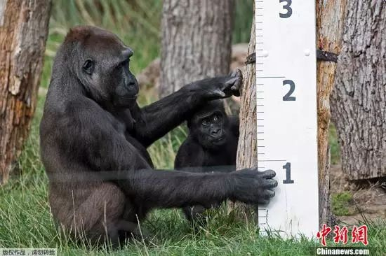 当地时间2017年8月24日,英国伦敦动物园年度体检开始,小黑猩猩“偷瞄”自己身高。