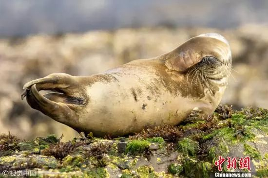 当地时间2017年5月11日,英国法尔恩群岛,摄影师Roger Coan经过法尔恩群岛是,将摄像机对准了一只在岩石上晒太阳的可爱的小海豹,这只害羞的小海豹一见到摄像机赶紧用前脚挡住脸躲避,十分害羞。图片来源:视觉中国