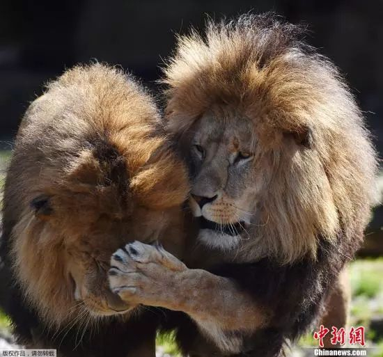 2017年3月23日,德国南部慕尼黑的Hellabrunn动物园,两只狮子正在玩耍。
