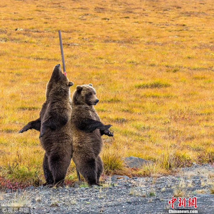 2017年10月19日消息,摄像爱好者Marcel Gross在美洲公路拍到两只大灰熊竟然站立、背靠背不知道在干什么,仔细观察发现它们竟然靠在同一根柱子上挠痒痒。图片来源:视觉中国