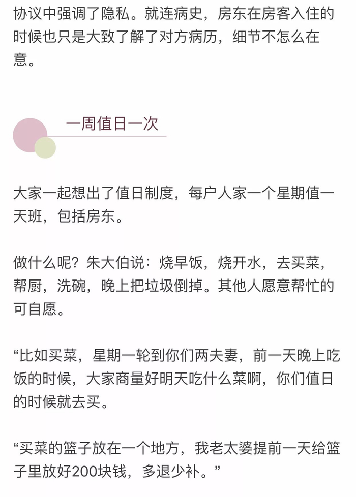 协议书对卫生绿化、不打听个人隐私、房屋租金、伙食费、值日等方面做了规定,一共11条,所有参与抱团养老的人都有签字,落款时间:2017年11月1日。