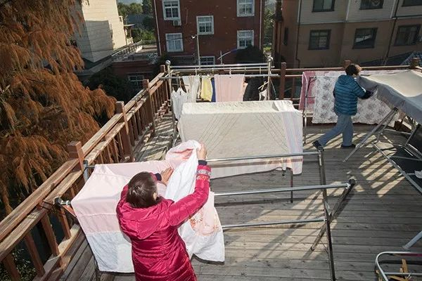 昨天下午2点多,许阿姨和金阿姨在三楼露台收被子。