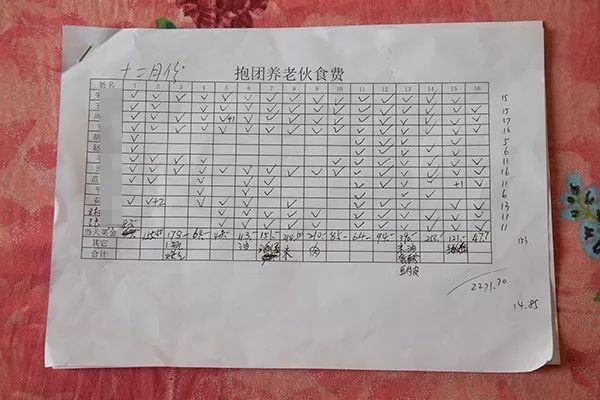 大伯走进一楼一个房间,掏出一张纸,写着12月份“抱团养老伙食费”,每个名字后面的空白处都打了很多钩。有几天有几个人会空着,表明那天他没吃。纸上面记了每个人用餐金额。