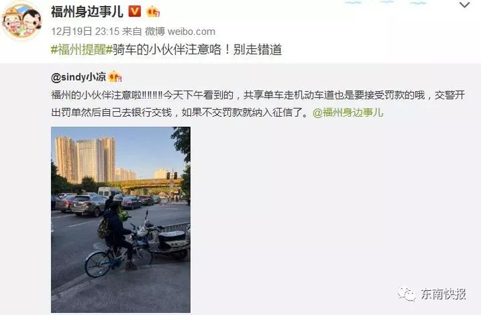 12月19日晚,网友“sindy小凉”发微博称,现在共享单车骑在机动车道上也是会被罚款的。该微博还配了张图↓↓↓