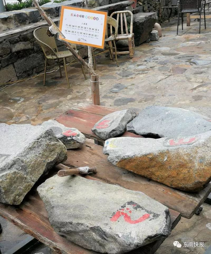 走近“石头会唱歌”艺术聚落,桌上摆着7块大小不一的石头,用锤子轻轻敲打,能发出不同的声音。之所以取名“石头会唱歌”,是因为几位来自台湾的年轻创业青年刚来到北港时,突发奇想,爬上君山寻找会发出不同曲调的石头,这些历经岁月的石头,在他们的手中被敲打出一首首美妙的乐曲。