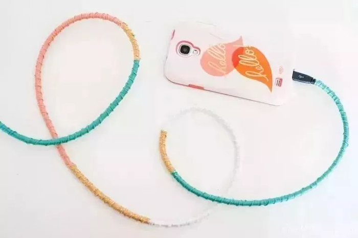 除此之外,还可以用彩绳进行修复,好看又安全!将彩绳缠绕在充电线上,每缠绕几圈就打一个结固定,这样重复编织,将破损的橡皮套覆盖后就可以了。