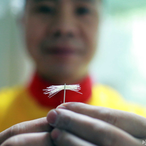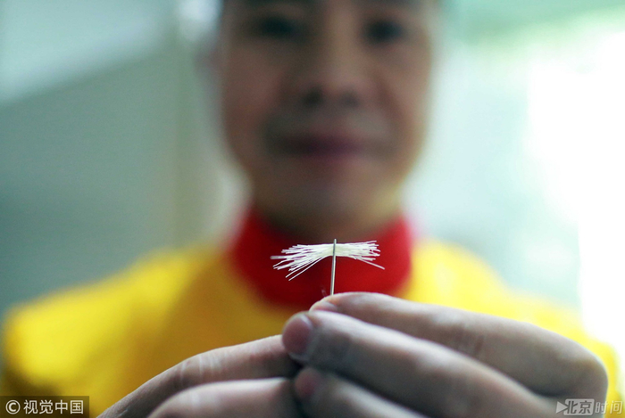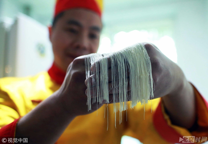 四川自贡籍师傅李红凯展示切面穿针眼。李师傅说,这是四川传统名小吃担担面的“升级版”——金丝面,面条直径仅0.067毫米。