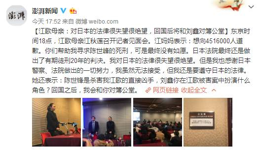 东京时间18点,江歌母亲江秋莲召开记者见面会。江妈妈表示:想向4516000人道歉。你们帮助我寻求陈世峰的死刑,可是最终没有如愿。日本法院最终还是做出了有期徒刑20年的判决。我对日本的法律很失望很绝望。但是我也感谢日本警察、法院做出的一切努力,我虽然无法接受,但我还是要遵守日本的法律。她还表示:陈世锋是杀害我江歌的直接凶手,刘鑫你在江歌被害案中扮演什么角色?回国之后,我会和你对簿公堂。