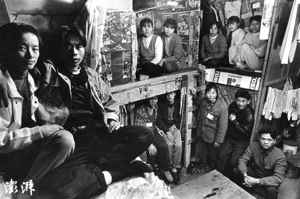 广东深圳的一间10余平方的棚屋里住了5对夫妻、4对老乡、1对姐妹,10张木床叠起摞起密密箍箍围成一圈,每个铺位住两人,帘子一拉,每个铺位就是一个小家。 张新民 摄