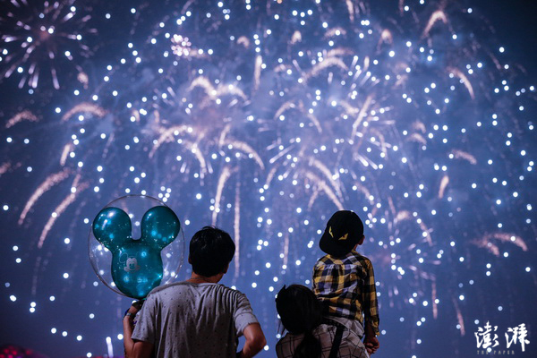 6月16日,上海,一家三口在迪士尼乐园外观赏盛大的焰火表演。当日,中国内地第一座、全球第六座迪士尼乐园——上海迪士尼正式开门迎客。 刘行喆 摄