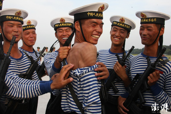 7月3日,北京昌平,阅兵村的训练场上,官兵们晒出了斑纹线。 张雷 摄