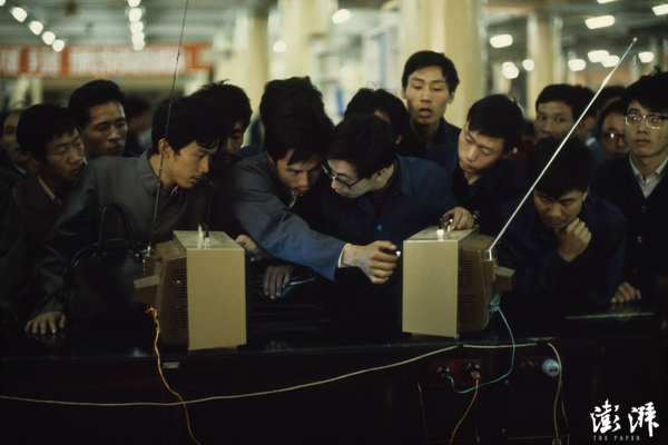 上海第一百货公司,几名男子在柜台调试电视机。上世纪80年代,电视机在中国刚刚兴起,这也逐渐成为了每家每户客厅的标配。 Bruce Dale 摄
