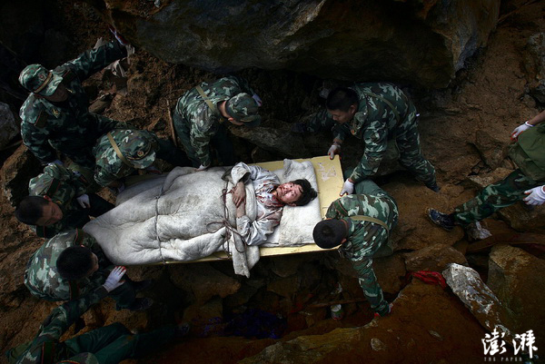 5月14日,四川北川县,8名解放军战士护送着一位地震伤员,小心翼翼地穿越乱石堆,把伤员送往安全地带。5月12日,四川汶川发生8.0级强震。 陈庆港 摄