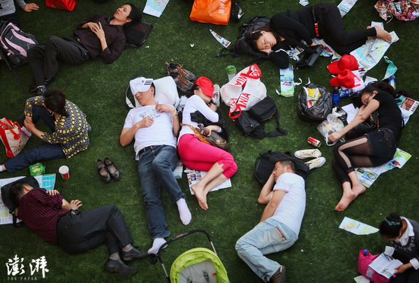 5月2日,上海世博会园区开园第二天,精疲力尽的游客在荷兰馆就地休息。 李锋 摄