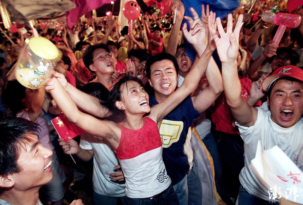 7月13日,北京,市民群众在中华世纪坛参加盛大欢庆活动。当晚,莫斯科当地时间18时10分(北京时间22时10分),北京成功申办2008年奥运会。 刘瑾 摄