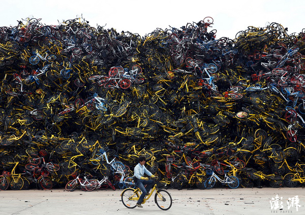 12月13日,厦门,工人骑车经过“共享单车山”。这一年,共享单车风潮席卷全国,被誉为中国新四大发明之一。 柳涛 摄