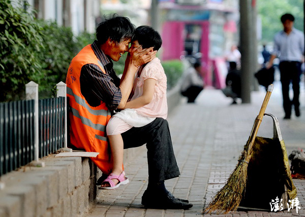 5月7日,江苏徐州,煤建路上,一位清洁工人坐在路边搂着自己的孙女亲昵。女孩的父母在北京打工,孙女从小随着爷爷奶奶在老家生活。 金钟 摄