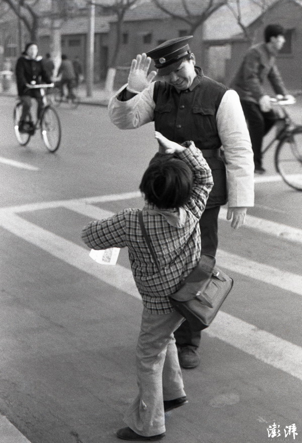 北京街头,画面中的警察是西四交通支队交警,他每天在此路口护送小学生过马路。 张兆增 摄