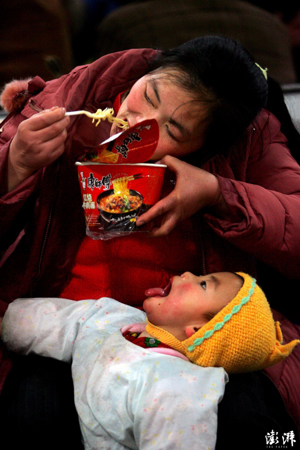 1月18日,北京西客站候车室,一位母亲为了喂年幼的孩子把方便面咬成小段,孩子却等不及地张大了嘴巴。 薛珺 摄