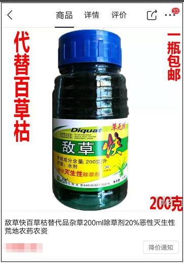 “这就是百草枯,只是换了商标名。国家不让卖百草枯了,撤销登记了,所以就给百草枯换了名。”一家农资超市的老板拿着手里的敌草快对记者说。