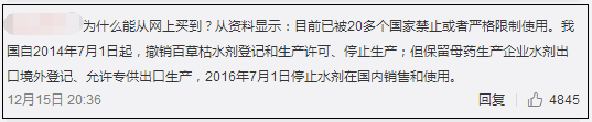 事情被报道后引发很多网友讨论,在人们感叹要珍爱生命的同时,一些网友也提出了质疑:百草枯不是自去年就被禁止销售了吗?为什么还可以买到?