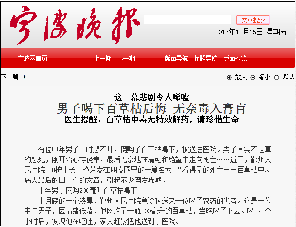 而宁波的这位喝百草枯导致农药中毒的男子却正是从网上购买了此农药服后中毒身亡,小编想问,距离“停止销售和使用”的规定实行已经一年多,为什么还能买到此农药呢?