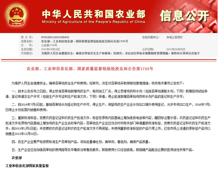 小编查阅资料发现,早在2012年,农业部、工业和信息化部、国家质量监督检验检疫总局就联合发布了公告,要求自2016年7月1日起停止百草枯水剂在国内销售和使用。