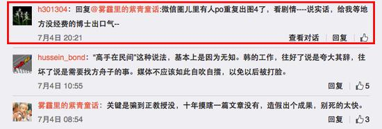 一位接近韩春雨的人士说,这个微博号是韩春雨本人,因为该微博号在2014年曾发表一篇关于实验室矛盾的长微博。该人士认为,“那篇文章就他(韩春雨)能写出来,内容就跟他当时说的一模一样。”