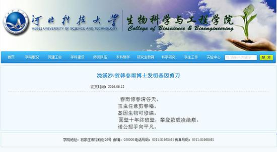 不管是中校区还是新校区,河北科大的学生和老师已经被校方告知,不能再对外谈论副教授韩春雨,以及由其引发的学术质疑事件。在生物科学与工程学院网站,对韩春雨的贺诗《浣溪沙/贺韩春雨博士发明基因剪刀》挂足了4个多月,经媒体报道后,悄然下线。那首诗如是写道: