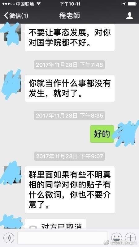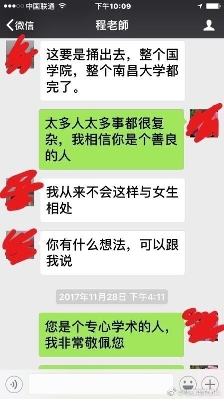 在此前的微博爆料中,有几张截图疑似为受害者与国学院院长程某的对话,对方要求受害者考虑事件影响,称“这要是捅出去,整个国学院,整个南昌大学都完了。”封面新闻(thecover.cn)也就此事向南昌大学宣传部进行了咨询,对方表示,目前他们并不清楚情况,所以对于截图真假无法判断。(来源封面新闻)