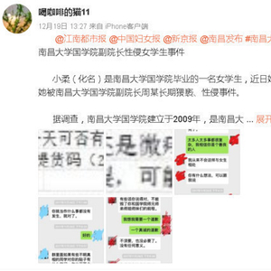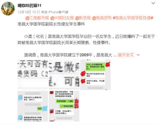 微博网友@喝咖啡的猫11 12月19日发帖称,小柔(化名)是南昌大学国学院毕业的一名女学生,在校期间长期遭国学院副院长周某猥亵、性侵。
