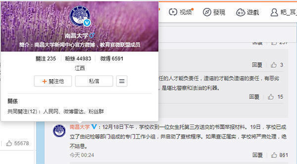 今日凌晨,南昌大学官方微博回复了此事,12月18日下午,学校收到一位女生托第三方送交的书面举报材料。19日,学校已成立了由纪检等部门组成的专门工作小组,并启动了查核程序。如果查证属实,学校将严肃处理,绝不姑息。(来源未来网)