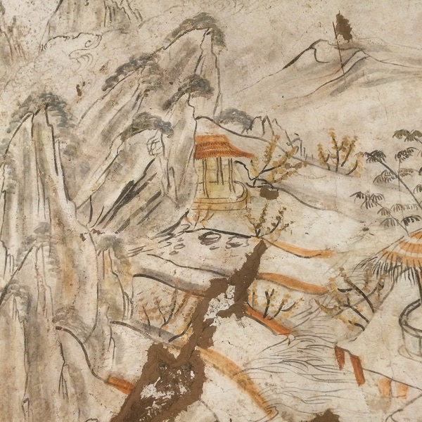 现场居然可见一幅完整的树石画——画山路两侧的巨石嶙峋, 古树虬曲伸展,老枝上, 一只乌鸦独卧, 树下翠草飘摇, 画石用笔果断厚重,画草则轻盈飘逸。后经介绍才知此是节愍太子壁画《马球图》背景图,并非独立的山水画作,而目前可见真正完整独立的考古山水画作则是韩休墓的山水画,且是前年刚刚发现。
