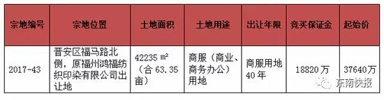 福州宗地2017-43号地块位于晋安区福马路北侧,原福州鸿福纺织印染有限公司出让地。