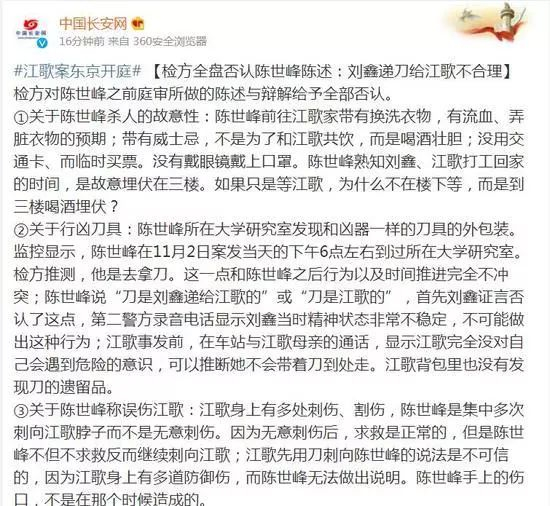 同时,检方认为陈世峰在前往江歌住处前准备了水果刀,并且有明确的计划性,犯有故意杀人罪。并且陈世峰在前往江歌家的途中,没有按常理乘坐地铁,而是走了两站后才买了张单程的车票,并且当天还特意带了换洗的衣物等。因此,检方认为陈世峰的杀人动机强烈、计划性明显。