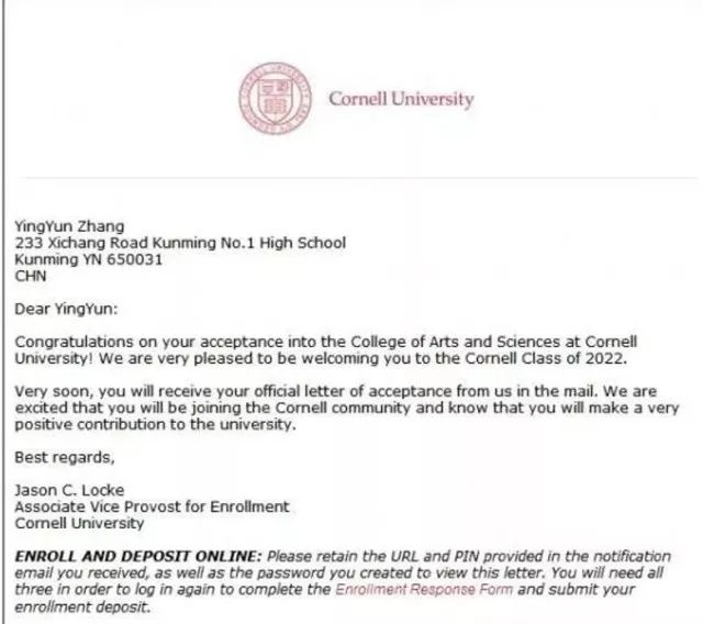 谢谢学校的培养!尤其要谢谢罗老师!正是由于她的鼓励与支持,孩子才敢于追逐她的梦想!如果她不到昆一中国际部上学,可能清华、北大都上不了(笑),现在居然能够去康奈尔(笑)!