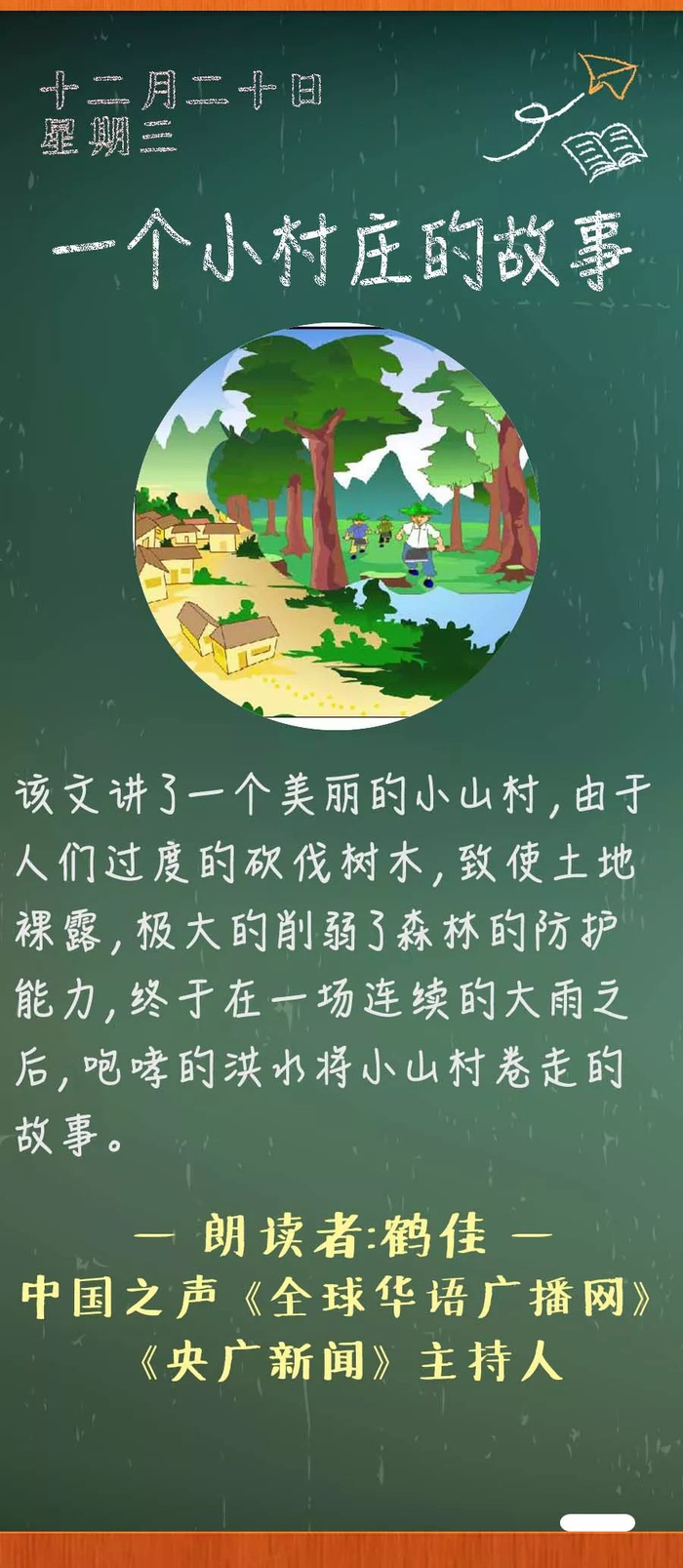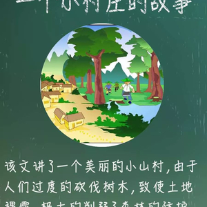《一个小村庄的故事》,讲了一个美丽的小山村,由于人们过度的砍伐树木,致使土地裸露,极大的削弱了森林的防护能力,终于在一场连续的大雨之后,咆哮的洪水将小山村卷走的故事。故事以此警示后人:人类的生存、生活,必须与自然和谐。