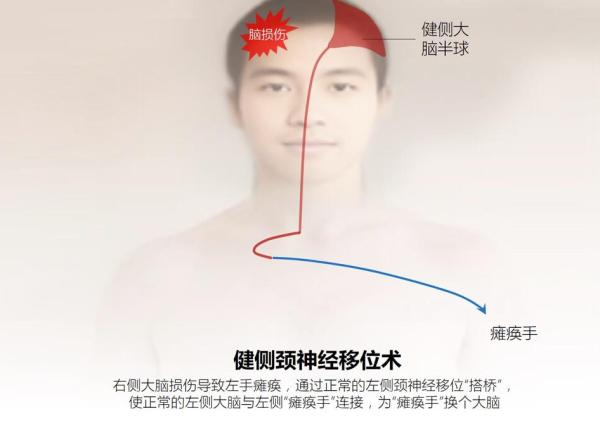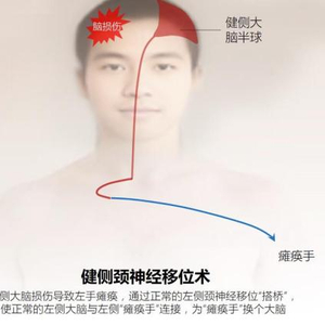 这种方法通过手术,将健侧(健康的一侧)上肢颈神经移位至瘫痪侧的颈神经,避开损伤侧大脑半球,让偏瘫上肢与同侧健康大脑半球相连接,激发健康大脑半球的潜能,促使瘫痪上肢恢复功能。