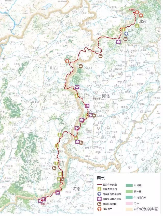 太行山国家森林步道穿越我国华北地区,北端位于北京关沟古道,南端河南神农山,全长2200公里。途经10处国家森林公园、1处国家级自然保护区、1处国家公园、10处国家级风景名胜区、7处国家地质公园、3处世界自然和文化遗产地。太行山是华北平原和黄土高原的天然分界线,温带天然林广泛分布。是华北民众走向自然荒野的最近平台。中太行和南太行山脊两侧地貌迥异,形成千峰耸立、万壑沟深、绝壁独特的太行景观。穿越佛教圣地五台山、八达岭长城、抗日战争八路军总部所在地等。