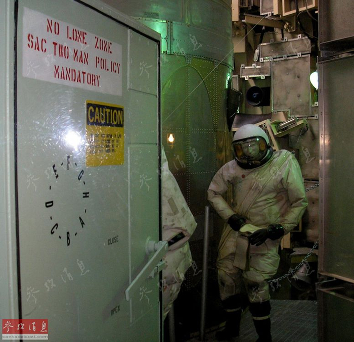 导弹发射井维护入口,能看到门上 时刻要保持两人执勤状态 的标语。