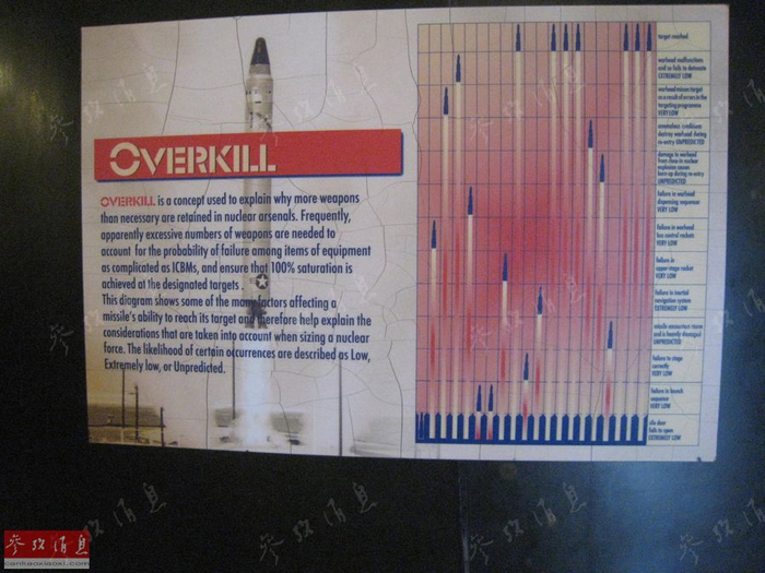 图为博物馆内关于“超量摧毁”(Overkill)概念的示意图,意为向对方发射大量核武器,确保对方的核反击力量能够被完全摧毁,泰坦II导弹的最大射程为1万千米。