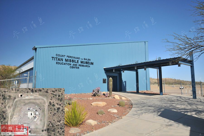 博物馆的地上设施部分十分不起眼,甚至可以用简陋来形容(英文标示为泰坦导弹博物馆 教育研究中心),但其所在位置距离墨西哥边境约60千米,周围都是荒漠,是建设导弹发射井的理想位置(小图为博物馆的卫星照片,红框标出的就是图中的蓝色建筑)。