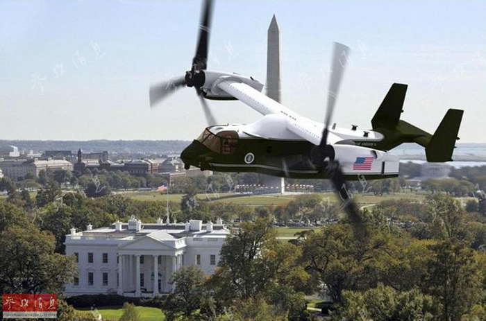 由于V-22曾一度有较高的中标希望,艺术家还绘制了“总统专机”涂装的V-22飞过白宫上空的想象图。