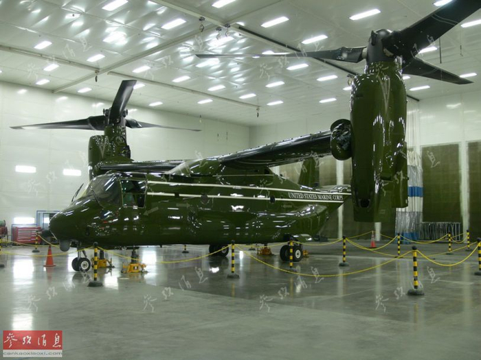 “9·11”事件之后,美国国防部于2002年启动了代号“VXX”项目的总统专用直升机替换计划,几经周折后,2010年,美海军宣布在新一轮招标中,将新锐的V-22倾转旋翼机纳入了候选范畴。图为正在更换总统专机 涂装的MV-22运输机。