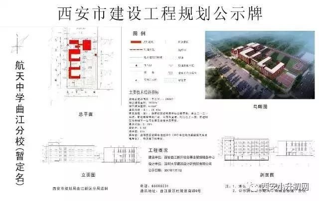 航天小学曲江分校(暂定名)项目位于西安市曲江新区新开门南路东侧,创意大道南侧,裴家埪小区西侧,航天中学曲江分校北侧。项目总建筑面积20267.6m2,规划班级数36班,主要建设4栋3层教学楼、1栋2层多功能厅、1栋4层综合办公楼、风雨操场等建筑与设施。计划于2018年9月1日开学。